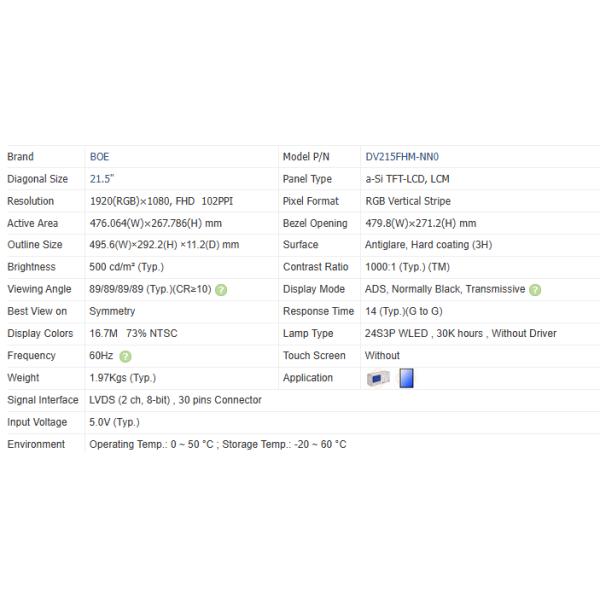 DV215FHM-NN0 is a 21.5" diagonal a-Si TFT-LCD display panel product from BOE Technology Group Co., Ltd. (hereafter called BOE), with an integral WLED backlight system, without backlight driver, without touch screen. It features an operating temperature range of 0 ~ 50°C , a storage temperature range of -20 ~ 60°C